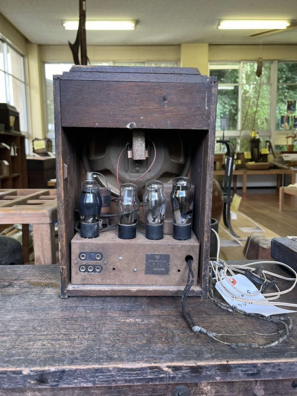 宮内地区社会教育センターにある甲佐町民俗資料館には、並四真空管ラジオが展示してあります。戦前〜戦後直後(昭和5年〜昭和23年頃)に松下無線株式会社(現パナソニック)で製作された物です。ST管4本の回路的には、簡単な作りです。今のラジオに比べると感度が悪く混信し、長いアンテナケーブルを接続して受信していました。