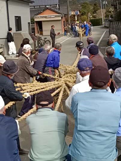 大綱作りは消防団が中心となり全家庭が参加し、住民の連帯、そして老若男女の交流の場ともなっています。大綱には引綱が編み込まれます。引綱は3本の小縄を一束にして、5mほどの長さに三つ編みにしたものを両端分として20本程編みます。大綱は小縄20本を一束にし3束を三つ編みで編んでいき途中に引綱を編み込んでいきます。とにかく縄が大きく三つ編み時にねじったりするために、人が中に巻き込まれたりのハプニングがあったりで悪戦苦闘しながらの共同作業です。出来上がった綱は、外周45cm、長さ50mの大綱になります。