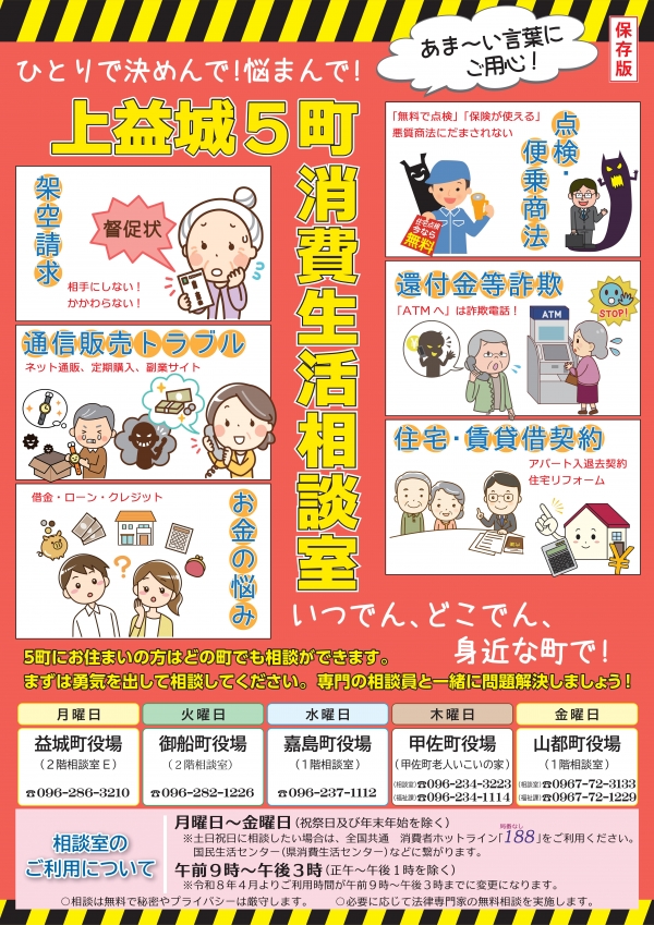 町では、上益城郡内の4町と連携して、消費生活相談室を開設しています。この相談室では、訪問販売や契約上のトラブル等の様々な消費者問題を専門の相談員が対応されます。相談は無料で秘密は守られますので、遠慮なくご相談ください。